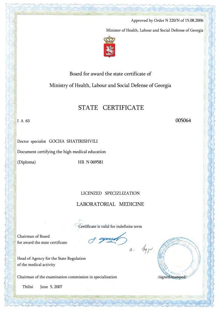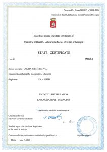 -1991- Obtention du Diplômé de l’Université Médicale d’État de Tbilissi ( avec mention honorable ). Qualification : Médecin