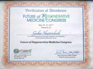 Docteur dès sciences médicales Gocha Shatirishvili est membre du Comité National géorgien de Transplantation et du Comité de Bioéthique de l’Université Médicale d’État de Tbilissi. Il est membre de l’Association du sang de cordon ombilical (Cord Blood Association) ( Comité des Affaires Gouvernementaux et Mondiales / Government and Global Affairs Committee, Geneva, IL, États-Unis ), de la Perinatal Stem Cell Society ( États-Unis ) et de l’Association américaine des banques du sang ( ABBA – American Blood Bank Association ), ( États-Unis ). Il a participé à de nombreux congrès et conférences à l’échelle mondiale, où il a été conférencier et a discuté de nombreux aspects de la thérapie par cellules souches.