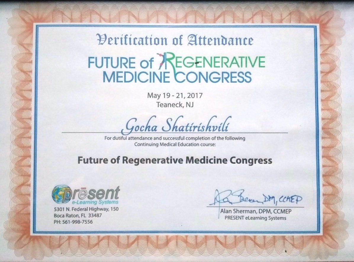 2017 : L’Avenir du Congrès de Médecine régénérative : « Prolonger et améliorer la vie avec la thérapie périnatale, adipeuse et de la moelle osseuse cellulaire », Teaneck, États-Unis