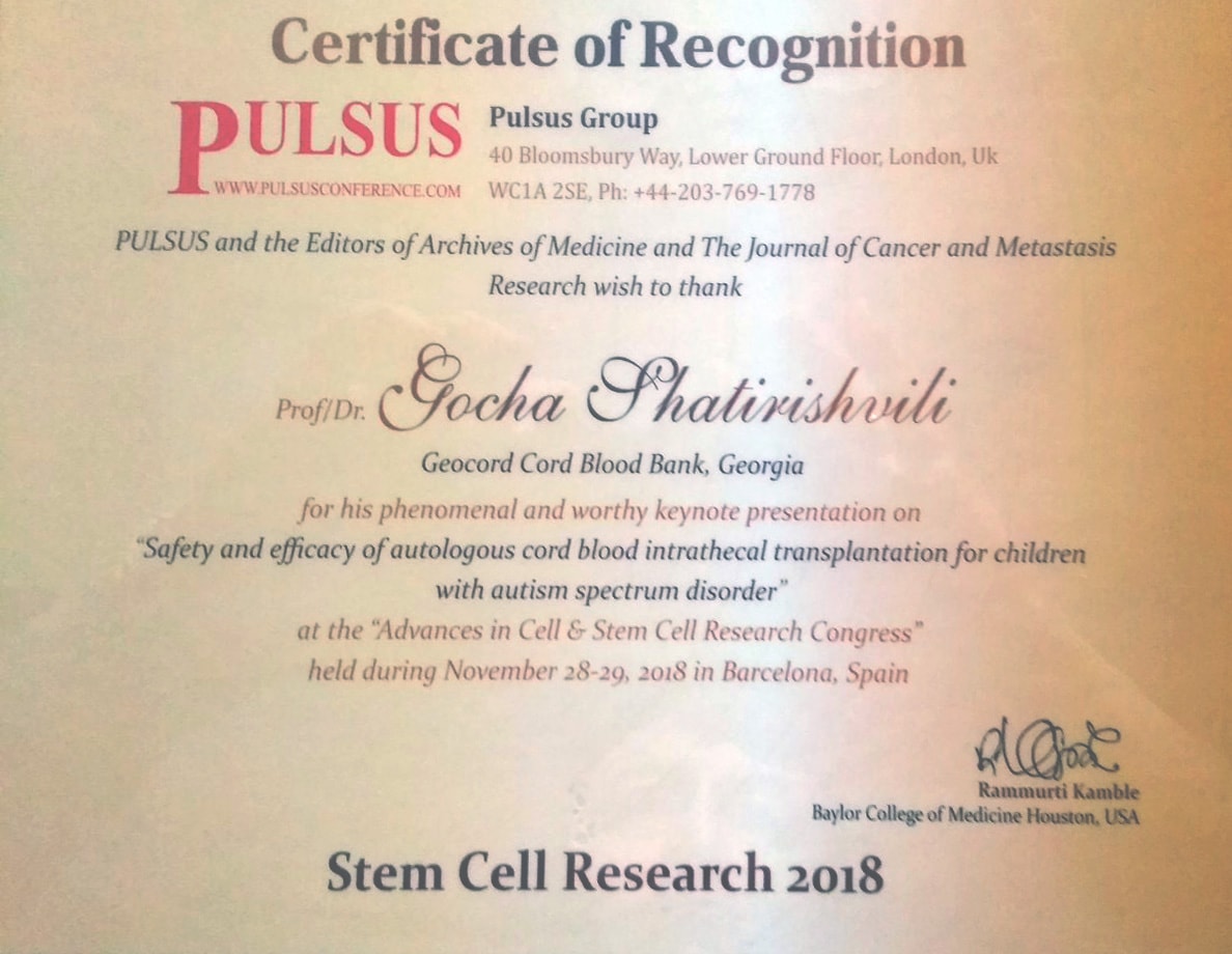 Docteur des Gocha Shatirishvili est Directeur médical de la banque « Géocord », spécialisée en stockage du sang ombilical à Tbilissi, Géorgie, et Chef spécialiste du Département de technologie et de thérapie cellulaire au Centre de recherche sur le cancer de Tbilissi. Il a obtenu son Doctorat à l’Université de Médecine de Lübeck (Allemagne). Depuis 2000, il oriente ses recherches sur la thérapie et les cellules souches. Il a consacré ses 18 ans de longue expérience à divers domaines : stockage du sang de cordon ombilical ; thérapie cellulaire par cellules souches de la moelle osseuse autogène (lésions de la moelle épinière, cirrhose du foie, insuffisance cardiaque, autisme) et cellules souches du sang de cordon ombilical (recherche continue sur l’autisme) ; immunothérapie avec les lymphokines activées par les cellules NK et les vaccins DC contre le cancer. Son étude a porté sur l’expansion des cellules souches hématopoïétiques (sang de cordon ombilical), l’expansion des MSC (funiculus umbilicalis et moelle osseuse). Docteur ès sciences médicales Shatirishvili a créé le Programme pour des troubles rares pour le Ministère de la Santé de Géorgie, a travaillé pour l’Office géorgien de la santé des altérations rares et a été membre du Conseil d’administration et expert du Syndrome International d’Alström (Jackson Laboratory, Bar Harbor, États-Unis).