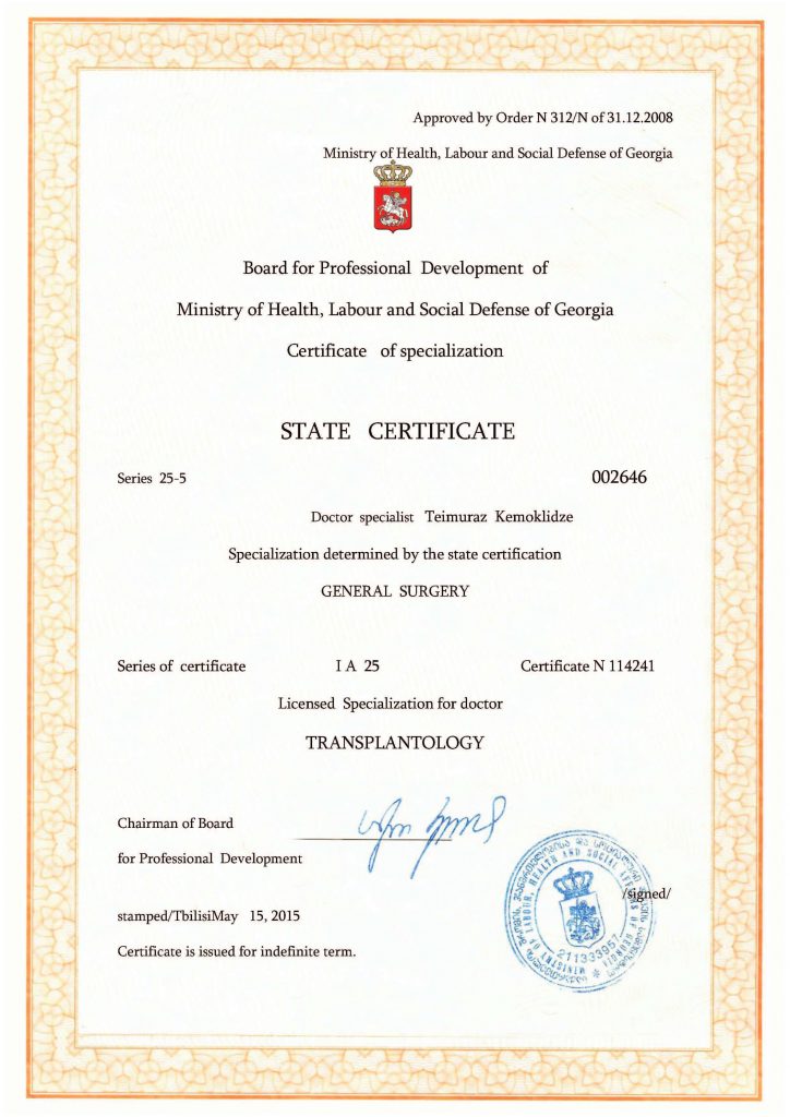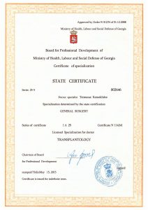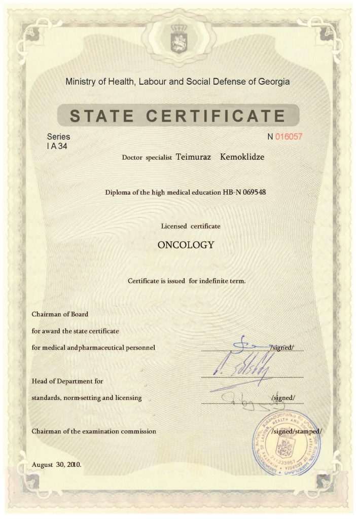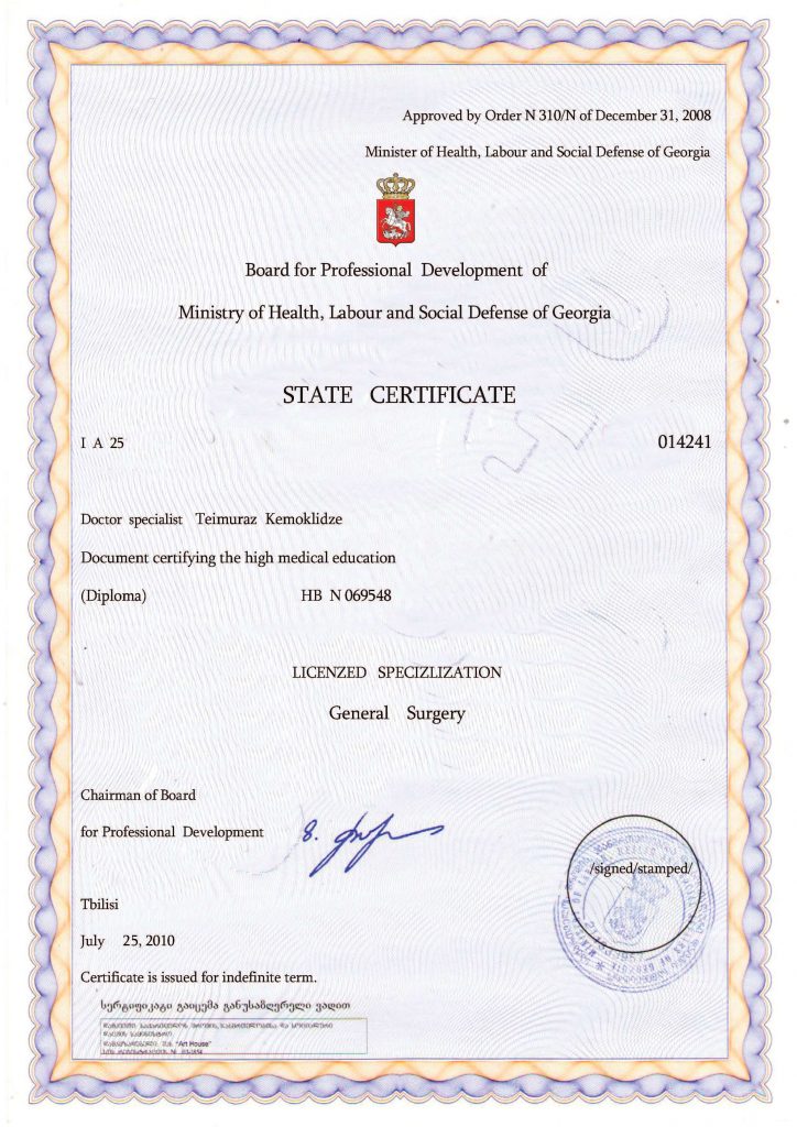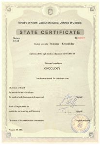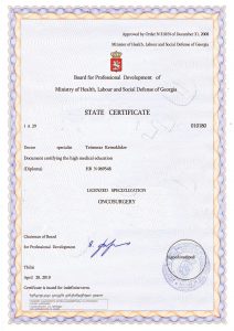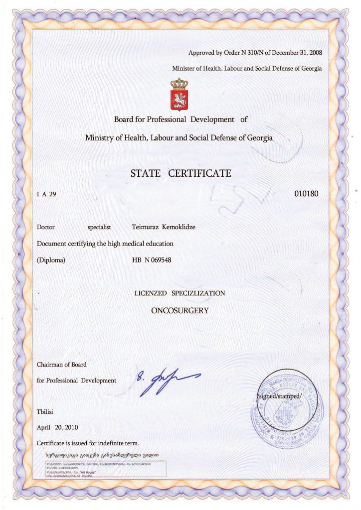 1997 : Diplôme de chirurgien oncologue, Tbilissi